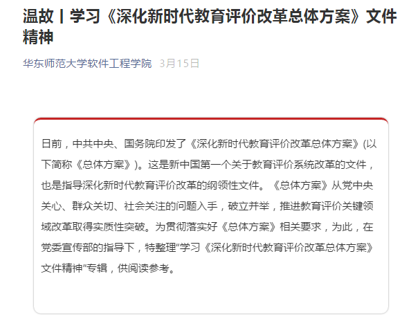 学院充分利用学习强国等平台组织全院上下开展学习,根据校党委宣传部编发的《理论学习参考》,整理“学习《深化新时代教育评价改革总体方案》文件精神”专辑,由学院微信公众号推送《温故丨学习<深化新时代教育评价改革总体方案>文件精神》,囊括重要文件、重要会议、权威解读、报道评论等模块,推动学习教育走深走实。学院大屏幕与电梯间每日滚动发布《深化新时代教育评价改革总体方案》相关内容,敦促学院教师加强政治学习,夯实理论基础。
