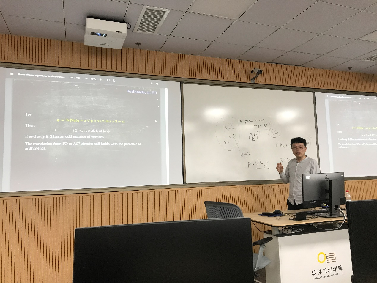 报告中,陈翌佳从城市监控摄像头的安装覆盖问题入手,引出了最小集合覆盖问题;从最简单的枚举算法、分治算法,到最后的并行算法,逐步提升算法的效率。在各种算法的介绍过程中,他普及了关于一阶逻辑的有限模型论、电路计算模型等相关知识,以及它们和算法设计之间的关系。会后,不少同学提出了各种问题,体现出浓厚的兴趣。