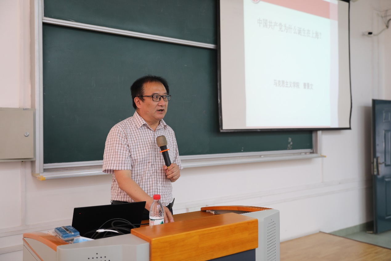 表彰会后,来自校马克思主义学院的曹景文教授作主题为《中国共产党为什么诞生在上海》的报告。他分别从近代中国工人阶级的聚集地、近代新型知识分子的聚集地、马克思主义在中国的传播起点、近代中国政治控制的边缘地带、苏俄和共产国际的选择、中国共产党发起组所作的卓越贡献等六大方面分析了原因。他用深入浅出的语言、具体真实的历史事件为在场的党员们带来了一场生动的报告会。