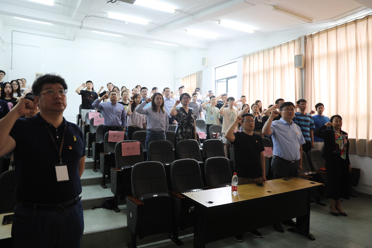 杜公卓就当下的社会现象和具体事件进行分享。她希望广大学子能常怀感恩之心,要学会与有不同意见的人相处,学会在逆境下成长,适应环境和社会的发展,努力真正成为对国家、对社会有用的栋梁之材。她向在场的党员们提出了四点不要:一是,不要忘记自己的政治站位;二是,不要忘记在专业学习的同时加强政治学习;三是,不要忽略国内外大事,保持对时事的敏感度;四是,不要忘记自己的责任,对自己负责、对家庭负责、对社会负责。在杜公卓老师的带领下,在场全体党员重温入党誓词。