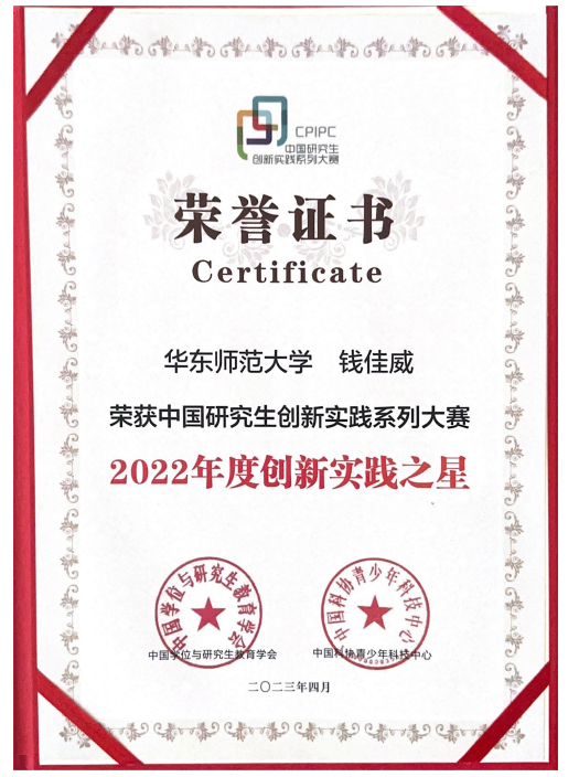 德赢官网Vwin博士毕业生钱佳威获得中国研究生创新实践系列大赛“2022年度创新实践之星”称号
